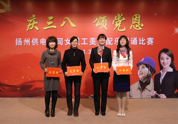揚(yáng)州供電公司女職工委員會(huì)3月4日下午舉辦“慶三八、頌黨恩——揚(yáng)州供電公司女職工美文配樂朗誦比賽”活動(dòng)。公司女職工選手以美文配樂朗誦的形式,向偉大的中國共產(chǎn)黨表達(dá)了由衷的熱愛。揚(yáng)州供電公司黨委書記馬愛杰、工會(huì)主席吳鴻出席活動(dòng),揚(yáng)州各縣公司工會(huì)主席、各基層分工會(huì)主席、女工委員、女職工代表90多人參加了這次活動(dòng)。