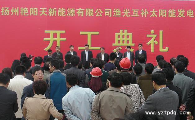 2014年4月18日,揚(yáng)州艷陽天新能源有限公司漁光互補(bǔ)太陽能發(fā)電項(xiàng)目開工奠基儀式在寶應(yīng)縣柳堡仁里蕩隆重舉行。寶應(yīng)縣相關(guān)領(lǐng)導(dǎo)、上海新能源行業(yè)協(xié)會(huì)會(huì)長朱元昊、揚(yáng)州艷陽天新能源有限公司負(fù)責(zé)人、柳堡各村(居)支部書記、各部門單位負(fù)責(zé)人、柳堡鎮(zhèn)機(jī)關(guān)全體干部等參加了開工奠基儀式。