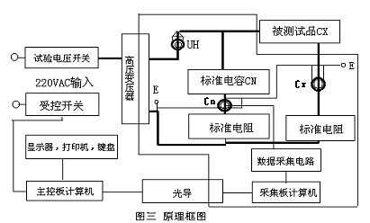 TPJSC系列智能化抗干擾介質(zhì)損耗測試儀測量線路包括一路標(biāo)準(zhǔn)回路和一路測試回路,如圖三所示。標(biāo)準(zhǔn)回路由內(nèi)置高壓穩(wěn)定度標(biāo)準(zhǔn)電容器與標(biāo)準(zhǔn)電阻網(wǎng)絡(luò)組成,由計(jì)算機(jī)實(shí)時(shí)采集標(biāo)準(zhǔn)回路電流與測試回路的電流幅值及其相位差,并算出被測試品電容容值(CX)和介質(zhì)損耗(tgδ)。