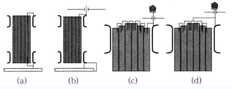 鐵芯接地方式如圖1所示。圖1中(a)是一種最簡單的接地方式,在油箱內(nèi)部完成,在同一側(cè)的上軛和下軛插入接地銅帶,上軛接地片與上夾件相接,下軛接地片與下夾件相接再與墊腳相接而接地,上夾件是通過鐵芯而接地的。這種方式多用于中等容量或較小容量的變壓器。圖1中(b)是鐵芯接地片與上夾件連結(jié),然后經(jīng)套管引出油箱外部再接地,下夾件與墊腳經(jīng)箱底接地,鐵芯與油箱間是絕緣的,這種結(jié)構(gòu)的上夾件不能與油箱接觸。圖1中(c)和(d)均用于鐵芯總厚度很大的大型變壓器,這種變壓器往往在疊片組中每隔一定厚度放置一層油隙,以改進(jìn)散熱性能,或每隔一定厚度墊一層絕緣紙以降低渦流損耗。這時鐵芯被隔開成若干組,切斷了電容接地的路徑。為求得電位的盡可能均勻,要把各個被隔開的片組用∩形銅帶串聯(lián)起來。如鐵芯厚度很大時,采用(d)方式,即由中央部分接地,可使電位更均勻些。