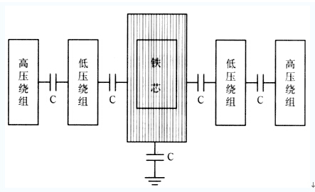 在變壓器正常運行中,帶電繞組及引線與油箱間構(gòu)成的電場為不均勻電場,鐵芯和其它金屬構(gòu)件就處于該電場中。圖2示出了變壓器鐵芯不接地時的斷面示意。由圖2可見,高壓繞組與低壓繞組之間、低壓繞組與鐵芯之間、鐵芯與大地(變壓器油箱)之間都存在著寄生電容,帶電繞組將通過寄生電容的耦合作用使鐵芯對地產(chǎn)生一定的電位,通常稱為懸浮電位。由于鐵芯及其它金屬構(gòu)件所處的位置不同,具有的懸浮電位也不同,當(dāng)兩點之間的電位差達(dá)到能夠擊穿其間的絕緣時,便產(chǎn)生火花放電,這種放電是斷續(xù)的,放電后兩點電位相同,但放電立即停止,然后再產(chǎn)生電位差,再放電……。斷續(xù)放電的結(jié)果使變壓器油分解,長期下去,逐漸使變壓器固體絕緣損壞,導(dǎo)致事故發(fā)生。為避免上述情況發(fā)生,國標(biāo)規(guī)定,變壓器鐵芯和較大金屬零件均應(yīng)通過油箱可靠接地,20 000 kVA及以上的變壓器,其鐵芯應(yīng)通過套管從油箱上部引出并可靠接地。具體做法是將變壓器鐵芯與變電站的接地系統(tǒng)可靠連接。這樣,鐵芯與大地之間的寄生電容被短接,使鐵芯處于零電位,這時在地線中流過的只是帶電繞組對鐵芯的寄生電容電流。對三相變壓器來說,由于三相結(jié)構(gòu)基本對稱,三相電壓對稱,所以三相繞組對鐵芯的電容電流之和幾乎等于0。