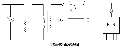 對這種情況,可采用電容沖擊放電法來進(jìn)行排除。圖4為電容充放電電路,使用時首先合雙向開關(guān)K到1側(cè),用直流高壓發(fā)生器對電容C充電,充電后快速把開關(guān)K合到2側(cè),對變壓器故障點放電。對1號主變實施了第一次沖擊,有間歇地反復(fù)進(jìn)行了7次沖擊后,測試鐵芯對地絕緣電阻為550MΩ,鐵芯接地故障得到了消除。