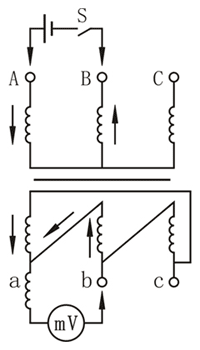 圖1-2 直流法測三相變壓器聯(lián)接組標號的接線圖