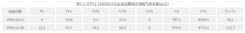如前所述,我們?cè)诶糜椭腥芙鈿怏w分析變壓器內(nèi)部故障時(shí),不僅注意油中氣體組分含量和特征氣體比值的判據(jù),而且還要綜合考慮氣體一些輔助的診斷判據(jù)。為此,我們以一臺(tái)150000/220主變壓器的鐵芯多點(diǎn)接地故障診斷為例,說(shuō)明油中溶解氣體分析為依據(jù)綜合診斷故障的大致全過(guò)程。