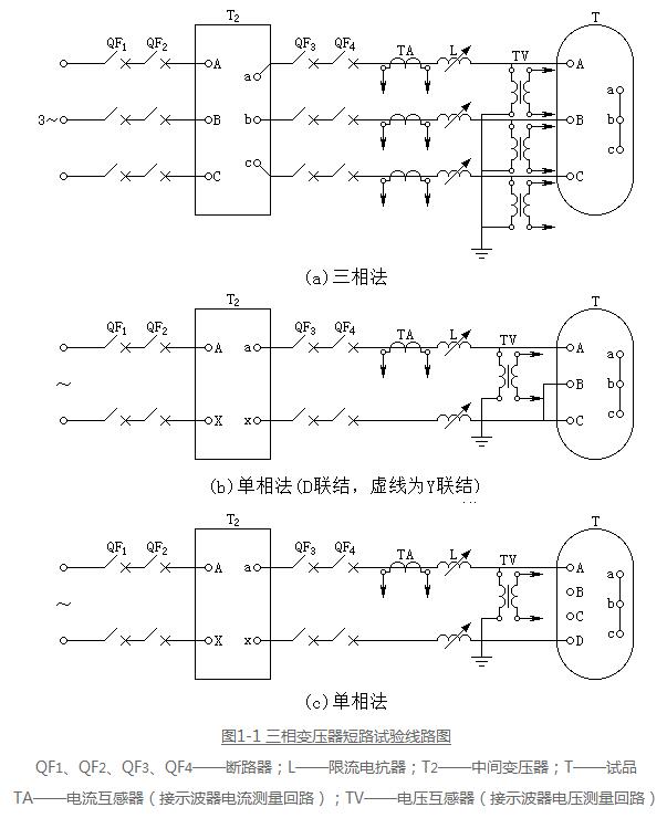 3、對于三角形聯(lián)結(jié)的繞組進(jìn)行三相試驗(yàn)時,如果低壓側(cè)為星形聯(lián)結(jié),可采用測量低壓電流的方法;對于三角形聯(lián)結(jié)的繞組進(jìn)行單相試驗(yàn)時,單相電壓應(yīng)施加在三角形的兩個角上,試驗(yàn)時的電壓應(yīng)與三相試驗(yàn)時的相間電壓相同;對于星形聯(lián)結(jié)繞組,如果電源容量不足以進(jìn)行上述單相試驗(yàn),而中性點(diǎn)可以利用且能承受相關(guān)的電流時,經(jīng)協(xié)商單相電源可施加于線端與中性點(diǎn)之間;具體的短路試驗(yàn)的線路原理見圖1-1。