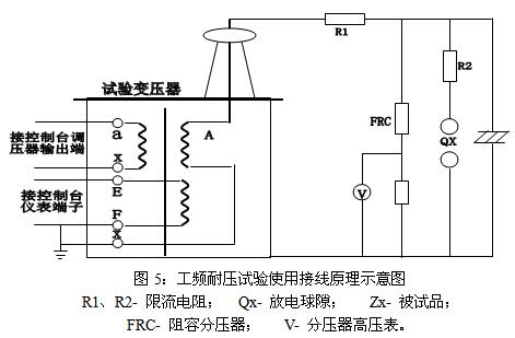 1、TPSBJ系列高壓試驗變壓器做工頻耐壓試驗使用接線方法見圖5。做工頻耐壓試驗前,先根據試驗變壓器的額定容量選擇好限流電阻,(水電阻)的阻值,再根據被試品需加的高壓電壓值調整好放電球隙的球間距,為了提高對被試品施加電壓的測量精度,應在高壓側接入FRC阻容分壓器來測量電壓。