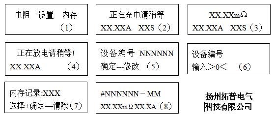 儀器開機或按復位鍵后,進入初始狀態(tài)(1)。此時光標指針指向“電阻”,直接按“確定”鍵進入狀態(tài)(2),顯示變化的充電電流和測量時間,充電完成后自動進入狀態(tài)(3),顯示電阻值、測量電流和測量時間,此時每一次“確定” 鍵則儲存一次測量結果(帶打印機的機型同時打印出測量結果)。按“復位”鍵退出電阻測量,進入狀態(tài)(4),顯示放電電流。放電結束后,自動回到初始狀態(tài)(1),完成一次電阻測量。