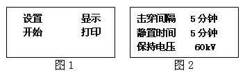 當設定的實驗完成后,顯示器將返回顯示菜單此時,選擇到“顯示”選項按“確認”鍵,顯示器可顯示每次擊穿值和平均值。并回到菜單下。 在菜單下,選擇到“打印”選項按“確認”鍵,打印機將打印一次所有實驗結果然后自動返回菜單。