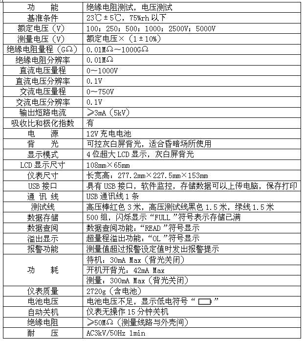 該絕緣電阻測試儀由中大規(guī)模集成電路組成。本表輸出功率大,輸出電壓等級多(有6個電壓等級)。 額定絕緣測試電壓范圍100V~5000V,絕緣電阻測量范圍0.01MΩ~1000GΩ。直流電壓測量范圍0~1000V,交流電壓測量范圍0~750V。