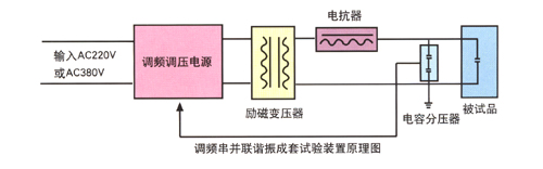 通過(guò)調(diào)頻控制器提供供電電源,試驗(yàn)電壓由勵(lì)磁變壓器經(jīng)過(guò)初步升壓后,使高電壓加在電抗器L和被試品C上,通過(guò)改變調(diào)頻控制器的輸出頻率,使回路處于串聯(lián)諧振狀態(tài)?;芈返闹C振頻率取決于被試品電容C和電抗器的電感L,調(diào)節(jié)變頻控制器的輸出電壓,使試品上高壓達(dá)到所需要的電壓值。