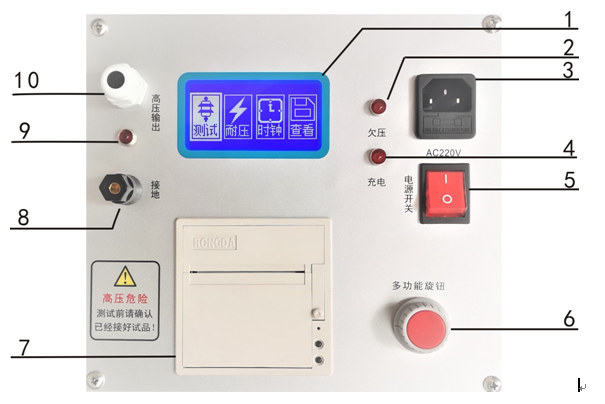 10、高壓輸出端(連接避雷器的一端,當開始測量時,此端輸出直流高壓,請注意安全!測試前請連接好被試品,請勿空載測試!)