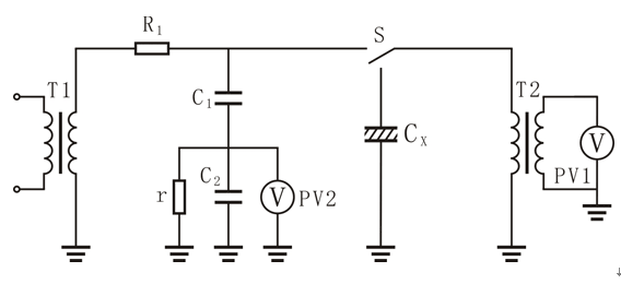 測量原理是:串聯(lián)電容器上電壓按電容值反比配,使被測電壓通過串聯(lián)的交直流分壓器進(jìn)行分壓,測出低電壓C2上的電壓U2,在用分壓比K算出被測電壓U1,即U1=KU2,K=(C1﹢C2)/C1