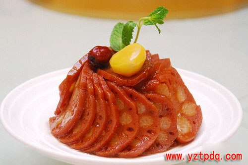 蜜餞捶藕為揚州寶應(yīng)十大名菜之首,曾載入清宮御食譜。它是用荷藕、糯米、蜜餞、白蓮為主原料,配以青梅、桔餅、蜂蜜等佐料,經(jīng)燜、拍、炸、蒸等10多道工序制作而成。它色澤醬紅,香甜酥爛,素而不淡,濃而不膩,有健脾開胃、生津止渴、減肥降壓、益腎固精之功效。藕片軟糯,食之香甜不膩。