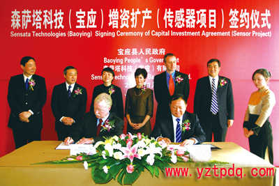 1月19日中午,美國森薩塔科技公司在揚州與我縣簽訂增資擴產(chǎn)協(xié)議,市委書記、市人大常委會主任王燕文,市委副書記、市長謝正義,副市長聞道才,森薩塔科技總裁兼首席運營官瑪莎·蘇利文女士,森薩塔科技執(zhí)行副總裁、首席財務(wù)官杰夫·科特先生,森薩塔科技運營高級副總裁迪克·丁先生,縣委書記、縣人大常委會主任仲生,縣委副書記、縣長王庭國,縣委副書記周玉寶,副縣長顧長榮以及市經(jīng)信委、商務(wù)局、質(zhì)監(jiān)局、海關(guān)、商檢局和我縣相關(guān)負責人等出席簽約儀式。