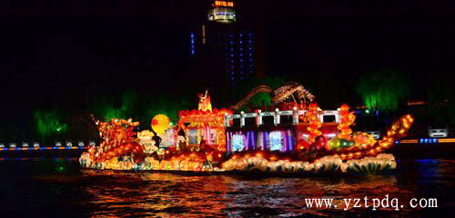 領(lǐng)航花船“揚(yáng)州號(hào)”是所有船只中體量最大的,它首先啟航,駛向夜色中,其他花船隨后次第駛來。記者看到,緊隨“二分明月”揚(yáng)州號(hào)的是“潮涌廣陵”的廣陵號(hào),隨后,“歌吹維揚(yáng)”的維揚(yáng)號(hào)、“百年冶春”的揚(yáng)子江號(hào)、“明月星輝”的新城西區(qū)號(hào)、“田園邗江”的邗江號(hào)、“山水儀征”的儀征號(hào)、“水潤揚(yáng)州”的水利號(hào)、“