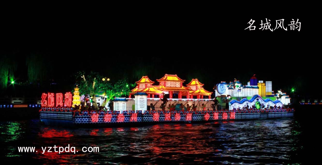 花船以古代城墻、傳統(tǒng)民居等元素體現(xiàn)揚州悠久的歷史文化,以唐代石塔、千年銀杏凸顯揚州的古城風(fēng)韻,展示揚州古城保護(hù)成就。以新建的“通江門橋”及高樓林立展示絢爛多彩的“城市之光”,寓意歷史傳承與現(xiàn)代文明的有機(jī)統(tǒng)一,展示當(dāng)代揚州人為建設(shè)古代文化和現(xiàn)代文明交相輝映的歷史名城的科學(xué)實踐。