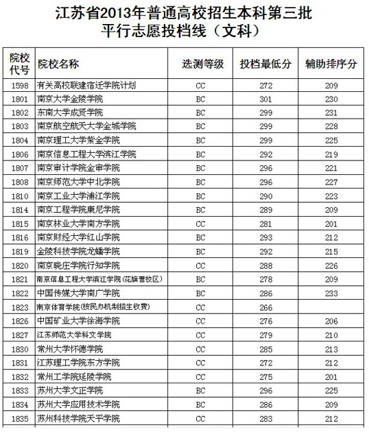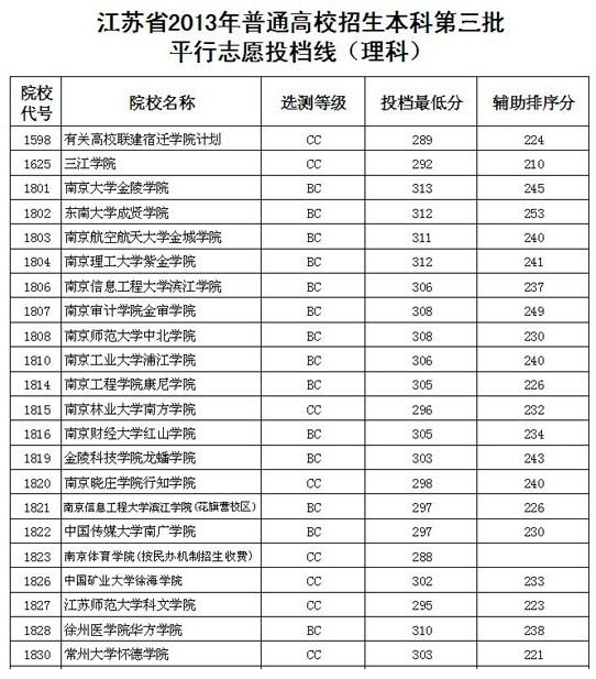 2013年8月3日上午,江蘇省考試院公布了《江蘇省2013年普通高校招生本科第三批平行志愿投檔線》,詳文見(jiàn)下: