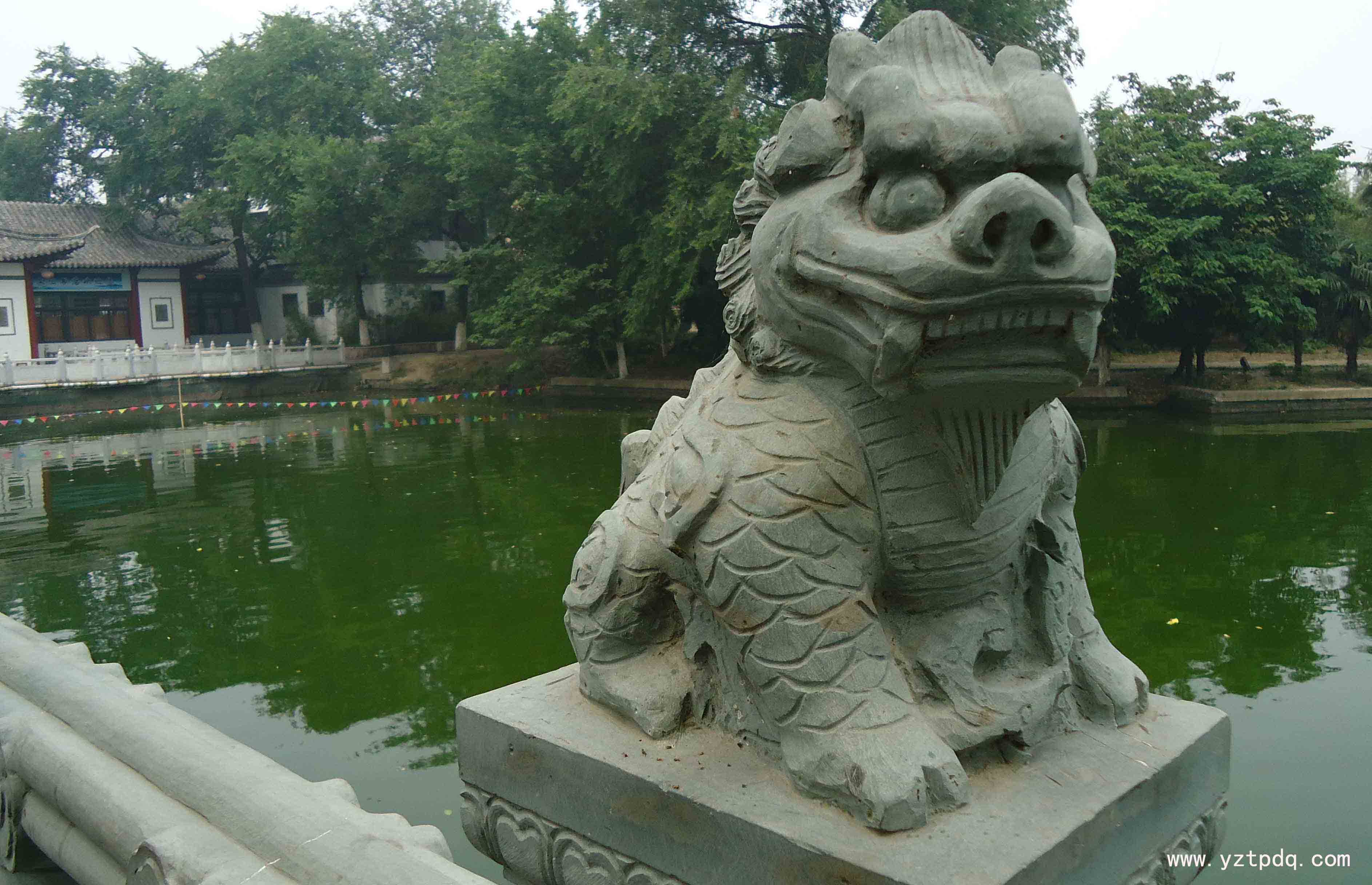 石獅又是幸運(yùn)的,在“文革”中,在那個所謂“破四舊”的動亂年代,寶應(yīng)有好心人,不知以什么樣的理由,將石獅一家埋于地下,使其免于一劫。改革開放的年代,在城市的擴(kuò)建筑路時,這對石獅又被挖出。神奇的是,除了幼獅的那條斷腿外,它們毫發(fā)無損。人們象迎接神獸一樣,將它們移至古城最佳風(fēng)景區(qū)縱棹園大門口。