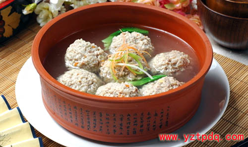 “獅子頭”,即揚州話說的“大斬肉”,北方話叫“大肉丸子”或“四喜丸子”。據(jù)說它的“遠祖”是南北朝《食經(jīng)》上所記載的“跳丸炙”(《齊民要術.炙法第八十》)。