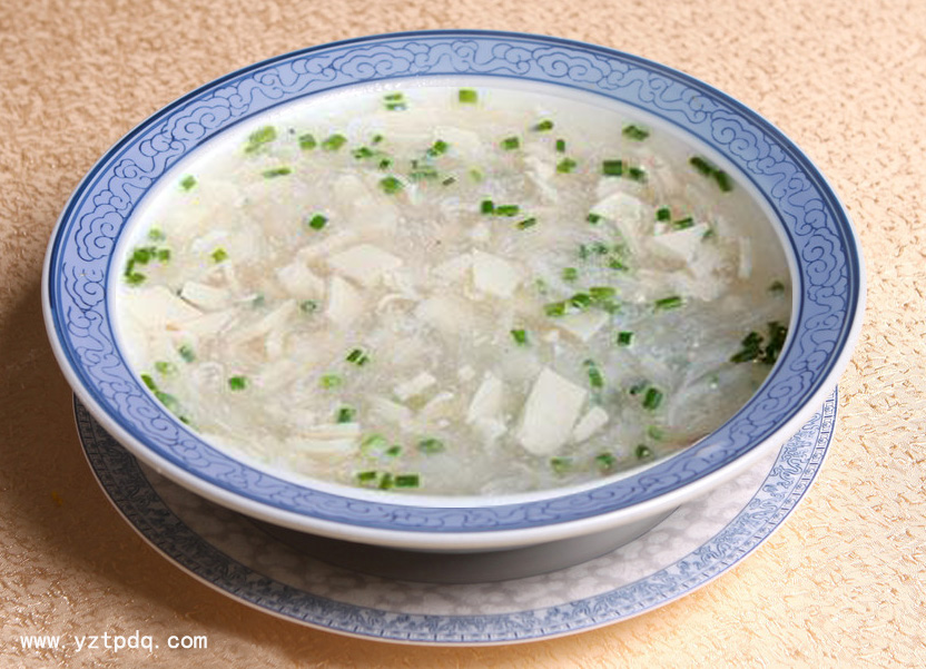 “雪花豆腐”菜名即珠湖雪浪。古代發(fā)明豆腐的是淮南王劉安,關(guān)于淮南王做豆腐的傳說很多:一說劉安在安徽淮南八公山上用大豆煉丹,偶然發(fā)現(xiàn)豆?jié){的凝固現(xiàn)象,逐漸試做出豆腐,在禪內(nèi)秘食,淮南王善于游禪交僧,一日嘗到了和尚們做的豆腐頓覺品味素新,便將豆腐的做法推廣到民間,相傳到各地;還有一說:淮南王劉安非常孝順父母,其母喜吃黃豆,漢高祖十一年時,淮南王的母親生了病,劉安主人把她平時愛吃的黃豆磨成粉,用水沖著喝,并為了調(diào)味放入了一些鹽,結(jié)果就是出現(xiàn)了蛋白質(zhì)凝集的現(xiàn)象,劉安的母親吃了很高興,病也是很快好了,于是鹽鹵點豆腐的技術(shù)便流傳下來。而首創(chuàng)“雪花豆腐”的是揚州高郵人,所以高郵的“雪花豆腐”風(fēng)味獨特。加工切成的豆腐塊細如飛雪,如珠湖之浪花,它鮮美、香甜、細嫩、光滑、舒適、暖胃,食后回味留連,越吃越想吃。藝術(shù)大師劉海粟曾為其題詞:“其味無窮”。