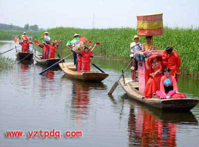 2、迎親,正日一早,男方家請(qǐng)的迎親者吃早茶后,就出發(fā)迎親。迎親者一般是三人,其中一人是喜奶奶,一人撐船,一人敲鑼。出發(fā)時(shí),男方家放鞭慶賀,鑼敲出莊外才能停止。到女方家莊子時(shí)再開(kāi)始敲鑼?zhuān)⒎乓粌蓚€(gè)天地響。以通知女方迎親的人要到了。女家以糖茶、棗子茶、圓子茶款待迎親的一批人,稱(chēng)之“三道茶”。
