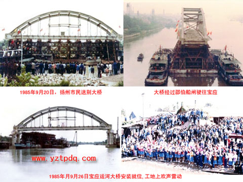 在揚州水利局檔案室內,記者看到一份檔案寫著這樣的文字:20世紀50年代后期,揚州大運河改道由灣頭瓦窯鋪至六圩入江,為方便運河兩岸交通往來,1960年6月建成揚州京杭運河大橋。橋寬12米,行車道寬7米,長194米,計有7個孔,中間為通航孔,凈跨50米,系鋼筋混凝土系桿拱,其余6孔為長20米的“T”型梁,是當時揚州區(qū)境內規(guī)模最大、技術標準最高的公路橋。1985年9月在原橋南側新建的運河大橋,與改造后的老橋合并為一體,原來大橋的系桿拱成了“廢物”,寶應正打算建大橋,于是決定整體搬到寶應。
