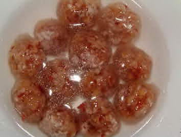 做藕粉圓子首先是制作圓子餡。將花生仁、芝麻仁、核桃仁炒熟焙干分別碾成細(xì)末。將紅棗或大棗煮爛去皮,加糖熬成糖泥后,分別與上述三種仁末同拌,做成小丸,成花生、芝麻、核桃餡料丸。將干藕粉散放在竹匾內(nèi),取丸餡在匾中滾動(dòng),粘上藕粉,取出,噴灑上微水,再入藕粉匾中滾過(guò),再取出,再噴水,再滾過(guò),直至藕粉圓子坯大小適當(dāng)為好。也有人將圓子生坯沸水內(nèi)一過(guò),再入匾中滾藕粉增大。后者方法做圓子雖快,但圓子表面粗糙,大小也難以一致。做藕粉圓子的高手所做出的藕粉圓子看上去大小一樣,表面光滑,賞心悅目。吃到口里是軟、綿、糯、香。下藕粉圓子并不復(fù)雜,和下普通圓子基本相似。鍋內(nèi)藕粉圓子在沸湯中浮起后,再加入一點(diǎn)冷水,再待湯沸鍋中的圓子全部上浮,呈半透明狀,圓子起暗紅色,即可用漏勺撈出盛到配有桂花糖鹵的碗中上席。
