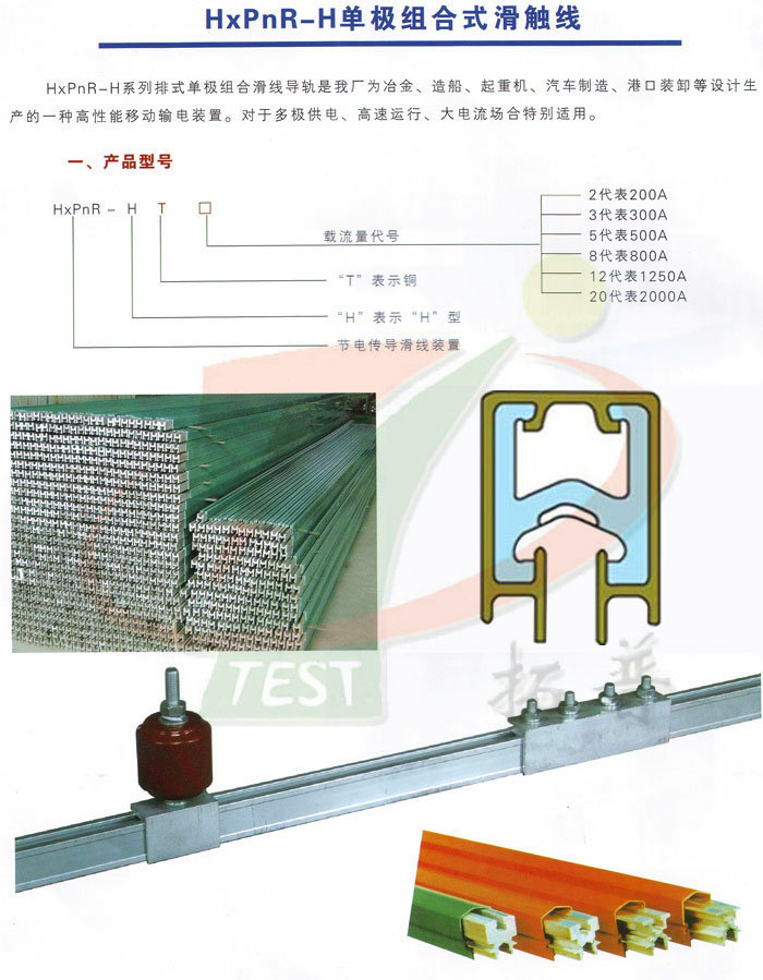 HXPnR- H系列單極組合式滑觸線由H型鋁合金本體導軌加壓V型不銹鋼滑接帶、PVC絕緣外殼、外置式集電器以及懸吊、固定等組件組合而成。該產(chǎn)品以其設(shè)計新穎、結(jié)構(gòu)合理、維護方便、使用安全等特點被廣泛應(yīng)用于電流較大、使用頻率較高、運行速度快和環(huán)境較差的場合。